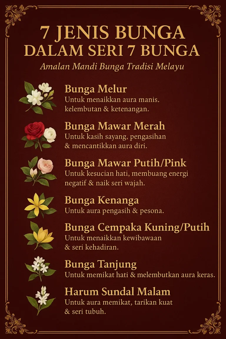 Seri 7 Bunga terkenal sebagai ikhtiar untuk ‘menghidupkan’ kembali daya tarikan diri, membuka aura seri & kasih sayang, dan melembutkan hati orang yang melihat mahupun mendengar suara anda. Mandian ini membantu menaikkan pesona semula jadi sehingga orang lebih mudah tertarik, lebih senang mesra, dan lebih suka bila bersama dengan anda.